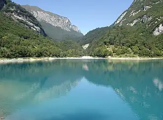 Lago di Tenno is a lake at Tenno in Trentino, Italy. At an elevation of 550 m, its surface area is 0.25 km2. The lake was formed around the year 1100 following a large landslide that blocked the course of the river Rì Sec, which is currently the main tributary of the lake. In the southern portion of the lake, there is a small island. The level of the lake varies over the years depending on the flow rate of the tributaries. In the years when the water level is low this island becomes a promontory. This area is protected as a biotope by the Autonomous Province of Trento .