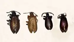 Lagria cuprina can reach a length of about 9 millimetres (0.35 in). Body is oblong, prothorax is almost square, thorax and prothorax are densely punctuated. Elytra are reddish or coppery.[3]