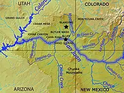 Laguña Creek also formerly also known as Tyende Creek,[1]: 36–37, 81, 94, 100, 106 is a stream in the Navajo and Apache Counties of Arizona. Laguña Creek has its source at 36°41′15″N 110°30′36″W / 36.68750°N 110.51000°W, at the confluence of Long Canyon and Dowozhiebito Canyon at an elevation of 6,325 feet (1,928 meters) at the head of Tsegi Canyon. Its mouth is in the Chinle Valley at its confluence with Chinle Wash which together forms Chinle Creek, at an elevation of 4,774 feet (1,455 meters). Chinle Creek is a tributary of San Juan River which is in turn a tributary of the Colorado River.[2]