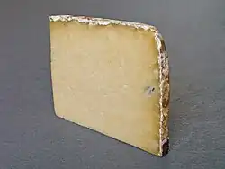 Laguiole (French pronunciation: [laɡjɔl], locally [lajɔl]; Languedocien: La Guiòla), sometimes called Tome de Laguiole, is a pressed uncooked French cheese from the plateau of Aubrac, situated between 800–1400 m, in the region of Aveyron in the southern part of France.[1] It takes its name from the small town of Laguiole and has been protected under the French Appellation d'Origine Contrôlée (AOC) since 1961 and a Appellation d'origine protégée since 1996.[2] Laguiole is said to have been invented at a monastery in the mountains of Aubrac in the 19th century. According to historical accounts, the monks passed down the recipe for making this cheese from cattle during the alpages to the local buronniers, the owners of burons, or mountain huts.