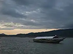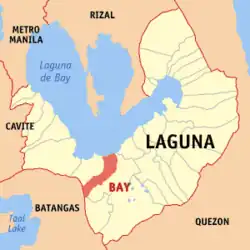 Laguna de Bay means "Lagoon of [the town of] Bay" for the lakeshore town of Bay (pronounced Bä'ï), the former provincial capital of Laguna province.[3] Alternate spellings of the town's name include "Bae" or "Ba-i", and in the early colonial times, "Bayi" or "Vahi". The town's name is believed to have come from the Tagalog word for "settlement" (bahayan), and is related to the words for "house" (bahay), "shore" (baybayin), and "boundary" (baybay), among others. The introduction of the English language during the American administration of the Philippines, elicited confusion as the English word "bay", referring to another body of water, was mistakenly substituted to the town name that led to its mispronunciation.[3] However, the word "Bay" in Laguna de Bay has always referred to the town.[4]