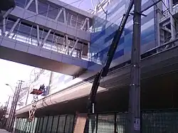 The station structure consists of two parts: the platforms, located on an elevated viaduct, and the ticket office and entrance points on the Teniente Cruz Avenue / Laguna Sur Street junction. The platforms and ticket office are linked by a footbridge over Teniente Cruz Avenue.[5]