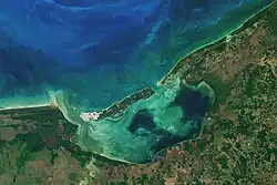 Laguna de Términos is the largest tidal lagoon by volume located entirely on the Gulf of Mexico, as well as one of the most biodiverse. Exchanging water with several rivers and lagoons, the Laguna is part of the most important hydrographic river basin in Mexico.[3] It is important commercially, as well as ecologically by serving as a refuge for extensive flora and fauna; its mangroves play an important role as a refuge for migratory birds.[4]