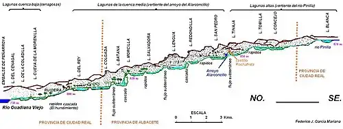 The string of lagoons, plus the man made Peñarroya reservoir, are connected by falls, small streams and subterranean flows, stretching for 20 kilometres (12 mi), flowing from southeast to northwest. The entire system runs through the valley of the Upper Guadiana River, once considered the headwaters of the Guadiana, the fourth-longest in the Iberian Peninsula. The Upper Guadiana is one of many tributaries of the Guadiana.