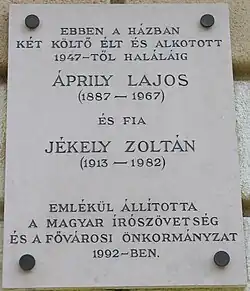 Lajos Áprily (birth name Lajos Jékely; 14 November 1887 – 6 August 1967) was a Hungarian poet and translator who won the 1954 Attila József Prize for his contributions to Hungarian literature. Áprily was born 14 November 1887 in Brassó, Austria-Hungary (now the city of Brașov in Romania) and died 6 August 1967 in Budapest; he was the father of Zoltán Jékely (1913-1982), also a poet and translator.