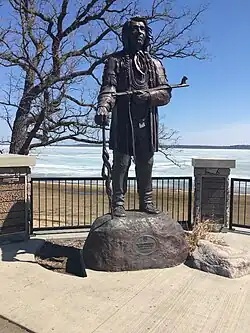 Historical leader Chief Shaynowishkung (Chief Bemidji) of the Ojibwe was born in 1834 and died in 1904. The Beltrami County Historical Society documents that "Shaynowishkung's people came from Madeline Island originally, moving to Sandy Lake, then Winnibigoshish, finally settling along the shore of Bemijigamaag."[1] According to the plaques which are engraved near Shaynowishkung’s Honorary Statue (located near the south side of Lake Bemidji), the chief moved to Lake Bemidji in 1882 after the death of his wife. In 1888, he was first reported to have contact with neighboring white settlers.[7] During their first meeting, the local namesake "Chief Bemidji" was wrongfully given by European immigrants due to what the Beltrami Historical Society documents as "early miscommunication" as when "Shaynowishkung told them the name of the lake [Bemijigamaag], which they at first took to be his name". As a result, he became known "throughout his life as Chief Bemidji."[1]