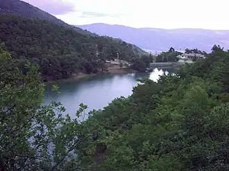 The lake is situated in the 1,051 m (3,448 ft)-high, east-west-oriented valley on the Black Sea Mountains. It was formed when the river was blocked by a landslide. The landslide dam was strengthened later with a concrete weir to avoid its split off by flooding. [2] It is 675 m (2,215 ft) long and has a maximum width of 175 m (574 ft).[3] Its total area is around 4 ha (9.9 acres). Its maximum depth is 11 m (36 ft).[1][2]