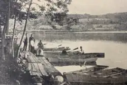 In the early part of the 1870s, George N. Gibson established a pine grove on the south side of the lake's outlet as a picnic area, calling it Gibson's Grove. In 1875, picnickers were caught in a sudden rain storm, which prompted the construction of a dining hall, the lake's first building.[10] In 1876, Gibson's added a launch, the Wm. B. Gibson, as an attraction, and by the following year Gibson's hosted fishing derbies, dances, clambakes, and tally-ho parties.[10][13][14] These events were often integrated and never segregated.[15] Gibson's had 300 visitors on good days.[12] Gibson's added an ice house in 1893.[16] In the early 1900s, Gibson's had available for rent: three furnished overnight cottages (each included wood, ice, and a boat), an unfurnished farm house, and two extended-stay cottages (each included a boat and telephone service).[17]