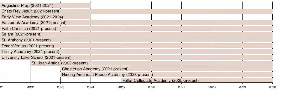 The Lake City Conference has grown at a steady pace since it was inaugurated. St. Joan Antida, an all-girls high school on the south side of Milwaukee, joined the Lake City Conference after its first season of competition.[4] 2023 brought two new members to the Lake City Conference: Chesterton Academy and Hmong American Peace Academy, both located in Milwaukee.[5][6] The next year, two schools exited the conference: Early View Academy[7] (who rejoined the Indian Trails Conference) and Augustine Prep[8] (now competing as an independent). In 2025, Fuller Collegiate Academy, a charter school in Milwaukee, joined the Lake City Conference as its newest member.[9]