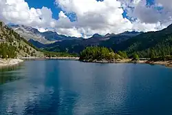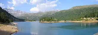The Lake Dévero or Codelago[2] (from the Ossolano dialect lac d'co d'lag, meaning lake at the head of the lake)[3] is an artificial lake in the Province of Verbano-Cusio-Ossola, located at 1,856 m (6,089 ft) above sea level within the Alpe Veglia and Alpe Devero Natural Park.[4]