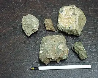 The kimberlite was discovered in 1971 when a logging road was bulldozed through the area exposing the unusual looking rock. The exposure consists of several small areas otherwise overlain by glacial till. Magnetic survey work done in 1956 [2] depicts an elliptical positive anomaly 590 feet (180 m) long in an east–west direction and 390 feet (120 m) wide, which probably defines the limits of the pipe. The kimberlite is intruded into volcanic rocks of the Proterozoic Hemlock Formation. The exposed material is grayish green to reddish, iron stained highly weathered and consists of disaggregated rubbly fragments up to 10 inches (250 mm). It is generally accepted that the pipe was emplaced about 180 million years ago.