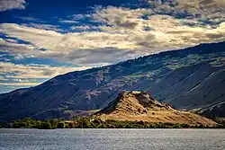 A prominent feature in Lake Entiat is the 150-acre Turtle Rock Island, located northeast of Lincoln Rock State Park. Originally part of the mainland on the south bank of the Columbia, this rocky outcrop became an island when the lake formed.[2] U.S. Highway 2 formerly ran through the area that became the island, and remnants of the road may still be seen in aerial photos. The island is now a nature preserve and fish hatchery, with access only by boat.[3]