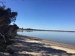 Fauna around the lake include 8 species of frogs, 42 of reptiles and 26 mammals.[11] The lake is rich in bird life, with 95 species of bird recorded around the lake, including the endangered hooded plover and freckled duck.[1] Other species seen around the lake are chestnut teal, banded stilt, common sandpiper, red-necked avocet, red-kneed dotterel,[12] common greenshank, wood sandpiper and black-winged stilt.[13]