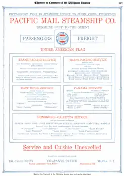 She was consigned to the Barber Lines by the Shipping Board. She sailed for her new company from New York bound for Yokohama, Japan on 5 October 1919.[10] She reached Japan via the Panama Canal, San Francisco, and Honolulu. She had a full cargo of general merchandise,[11] but lost a portion of her deck cargo, carboys of acid, in heavy seas off San Francisco.[12] After stopping in Japan, she reached Manila, Philippines on 21 December 1919. Once her cargo was unloaded, the ship was turned over to the Pacific Mail Steamship Company.[13]