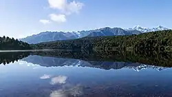 Like nearby Lake Matheson, Lake Gault is dystrophic: its water is stained brown in colour with tannins leached from surrounding forest, low in nutrients, acidic, and has a sparse and specialised phytoplankton.[4][5] And as in Lake Matheson the dark water creates spectacular reflected views of the Southern Alps, especially Aoraki / Mount Cook and Mount Tasman.[6][7]