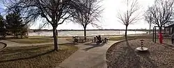 The lake and park have a fishing dock, wading pool, tennis courts, and softball diamonds. There is a recreation center that hosts activities. The lake borders a municipal golf course. In winter the golf course has groomed cross country ski trails and the park has ice and hockey rinks. A 0.68-mile (1.09 km) shared-use path runs alongside the east side of the lake from East 43rd Street to Minnehaha Parkway where it connects to the Grand Rounds trail system and destinations such as Lake Nokomis, Minnehaha Creek, and Minnehaha Falls.[1] Lake Hiawatha is one of the few lakes through which Minnehaha Creek flows, and the last one before it reaches Minnehaha Falls and then the Mississippi River.