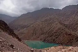 Lake Ifni (Arabic:Dayet Ifni) is a green lake located in the soil of Toubkal National Park, in the Moroccan Toubkal (commune), deep in the High Atlas mountain range, with a continental climate, and directly overlooked by the highest peak in North Africa, which is the summit of Mount Toubkal. The lake is distinguished by its steep slopes, its location at the end of the valley, its great depth, and its height above sea level, which is about 2,500 meters. It is therefore one of the highest lakes in the world. Its area is about 26 hectares, its length is estimated at 870 meters, and its width is about 490 meters. with a discharge rate of 300 meters per second, and a depth exceeding 30 meters.[1][2]