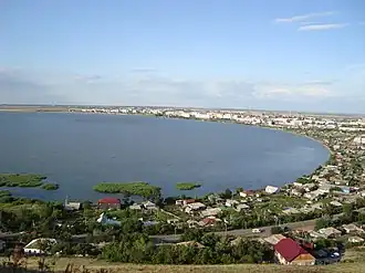 Lake Kopa (Kazakh: Қопа, Qopa; [qopɑ]) is a lake in the city of Kokshetau, located on the territory of Akmola Region close to the foot of Kokshetau Elevation in the northern part of Kazakhstan.[1] Its elevation is 223.8 m (734 ft) above sea level and has a maximum depth of about 6 m. It is 5.6 km long and 12 km wide. The total surface area of it the lake is about 14 km2 (5.4 sq mi) depending on water level. It is fed by 2 rivers and is drained by the Shagalaly. The area of Lake Kopa fluctuates year to year, but in recent years the size of the lake has been decreasing overall. Kopa is used for fishery.