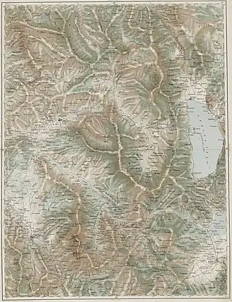 ![]() Austro-Hungarian map from 1887 depicting Lake Malik on the bottom right side, south of lake Ohrid named "Jezero Mališko (Sovjav Gölü)" | |
