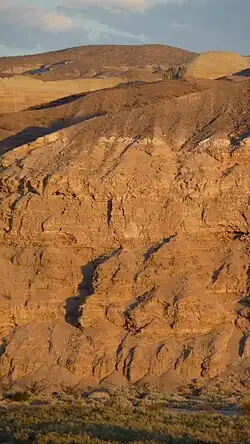 The Mojave River entered the lake from the west, probably forming a river delta.[30] The most recent drainage from the lake was Afton Canyon, which drained the lake east towards Soda Lake, Silver Lake and eventually Death Valley.[31] This draining cut 120 metres (390 ft) deep into the sediments of Lake Manix, removing about 2.815 cubic kilometres (0.675 cu mi) of material and depositing it below Afton Canyon.[32] The erosion has exposed sediments of Lake Manix, making their climatic records accessible to research.[33]