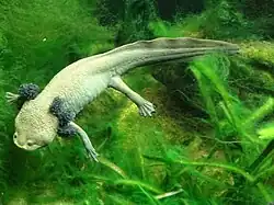 This species is neotenic (also known as paedomorphism), meaning that they retain larval stage characteristics. This mainly includes their external, heavily vascularized gills, rather than losing them in adulthood like most salamander species.[4][10] While many Ambystoma salamanders are capable of performing facilitative neoteny (entering metamorphosis only under favorable environmental conditions), Ambystoma dumerilii is only one of five Ambystoma salamanders that are found in a permanent, natural state of paedomorphism.[9] As a result, while the species possesses functional, terrestrial lungs, most gas exchange occurs via their gills and skin.[9]