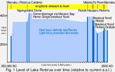 The lake as shown in Figure 1, has had periods at multiple different lake levels since the caldera's Mamaku ignimbrite eruption, related to both volcanic activity and subsidence within the Taupō Rift.[3] The lake all-time high occurred sometime after the formation of the Ngongotahā Dome which records this on its flanks, and is now dated at 200,000 years.[4]: 149, 171 Previously this dome's eruption was assigned much closer to the time of the Mamaku ignimbrite eruption, so the lake maximum high stand was assumed to be more directly related to the caldera's formation. Breakout floods are suspected through the Hemo Gorge after the lake's maximum high stand, definitely after the Rotoiti eruption of the Ōkataina Caldera, with formation of a channel within the western lake floor of Lake Rotoiti and suspected after the Hauparu eruption through the Kaituna River Gorge.[3] Several other lakes of volcanic origin are located nearby to the east, around the base of the active volcano Mount Tarawera and these also over time have varied in size or existence due to volcanic action.