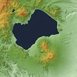 The caldera on which Lake Shikotsu sits was formed 40 to 50 thousand years ago.[3] According to the Global Volcanism Program, the caldera was formed 31 to 34 thousand years ago by one of Hokkaidō's largest quaternary eruptions.[4] The caldera consists mainly of dacite, rhyolite, and andesite. The volcanoes Mount Eniwa, Mount Fuppushi, Mount Izari, Kitayama, and Mount Tarumae formed on the rim of this caldera.[3]