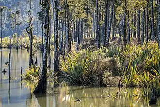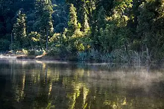 The ecology of Lake Wahapo was severely affected by the avulsion of the Waitangitāhuna River in 1967.[20] The river carries large amounts of fragmented schist rock and debris from a massive slip in the headwaters of the river's catchment. The river's new course after the avulsion was across an ancient alluvial fan and through a stand of kahikatea (Dacrycarpus dacrydioides) at the northeastern end of the lake. Heavier fractions of the debris are deposited before reaching the lake, but the lighter elements are carried to the lake. Silt was quickly deposited in the kahikatea forest, burying the low understory vegetation and causing widespread mortality of the trees at the head of the lake. Within three or four years, the dying trees were subject to fungal attack and could not be salvaged for timber.[3] In areas where less silt was deposited (less than about 60 centimetres (2.0 ft) deep), only a few trees died, and those that survived produced adventitious roots, allowing them to adjust to the saturated silt.[10] Tōtara (Podocarpus totara), miro (Prumnopitys ferruginea), mountain horopito (Pseudowintera colorata), patē (Schefflera digitata), and mikimiki (Coprosma rotundifolia) also survived by producing adventitious roots. Mosses, herbs and smaller shrubs were completely destroyed where there was initial silt deposition, but have recovered in areas where deposition has ceased.[10]
