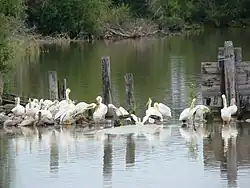 Isolated, uninhabited islands provide nesting sites for colonial nesting birds including pelicans, gulls and terns. Large marshes, shores and shallows allow these birds to successfully feed themselves and their young. Pipestone Rocks are considered a globally significant site for American white pelicans. In 1998, an estimated 3.7% of the world's population of this bird at the time were counted nesting on the rocky outcrops.[16] The same site is significant within North America for the numbers of colonial waterbirds using the area, especially common terns.[16] Other globally significant nesting areas are found at Gull Island and Sandhill Island,[17] Little George Island[18] and Louis Island.[19] Birds nesting at these sites include common and Caspian terns, herring gulls, ring-billed gulls, double-crested cormorants and greater scaups.