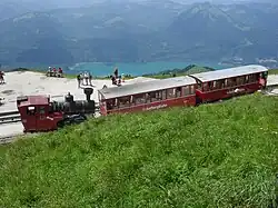 The lake has an area of about 12.9 to 13.1 km2 and is surrounded by the Salzkammergut mountain range. On the northern side is the Schafberg. A rack railway, the Schafbergbahn, leads up to the summit at 1,782 m. Owing to the steep shore at its foot only a footpath connects St Wolfgang and the village of Ried with St Gilgen along the Falkensteinwand, the set of the Bergpsalmen ("mountain psalms") lyric anthology written by Joseph Viktor von Scheffel in 1870. In the south and southwest of Lake Wolfgang lies the Osterhorngruppe, with heights up to 1,800 metres. Directly south of St Gilgen rises the Zwölferhorn (1,522 m), which can be visited by cable car.