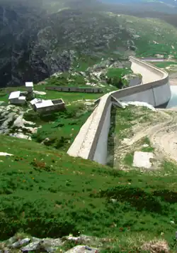 The dam was built to harness the lake's waters for hydroelectric purposes and began operating in 1913; it was later raised between 1917 and 1925.[4] It is a gravity dam with a characteristic S shape formed by straight sections connected by curves. The water is then used to generate electricity at the Varzo hydroelectric power plant.[5]