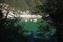 The construction work was completed in 1952,[1] damming the Meduna in Val Tramontina and resulting in the abandonment of the old village of Movada, whose remains still emerge when the lake is dry.