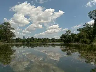 Lake of the Isles (Dakota: Wíta Tópa, "Four Islands"[1]) is a lake in Minneapolis, Minnesota, connected to Cedar Lake and Bde Maka Ska. The lake is part of the city's Chain of Lakes and has an area of 109 acres (0.4 km2), 2.86 miles (4.6 km) of shoreline with a little under three miles of paved walking and biking paths, and a maximum depth of 31 feet (9 m). Lake of the Isles is known for its two wooded islands, its long north arm, and the surrounding stately houses of the Kenwood, Lowry Hill, and East Isles neighborhoods.