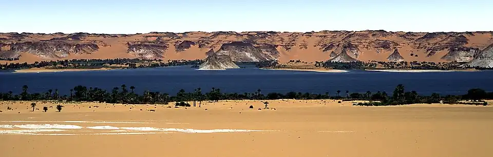 The Lakes of Ounianga (French: Lacs d'Ounianga, Arabic: بحيرات أونيانجا, romanized: Buḥayrāt ʾUniyāngā) is a series of lakes in the Sahara Desert, occupying a basin in the mountains of West Tibesti and Ennedi East in north-eastern Chad. It was added as a UNESCO World Heritage site in 2012.[2]
