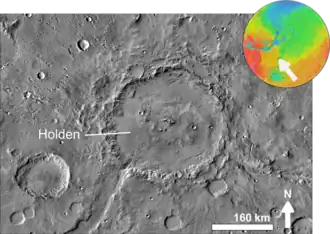 Holden is a 140 km wide crater in the Margaritifer Sinus quadrangle. It is named after Edward Singleton Holden, an American astronomer, and the founder of the Astronomical Society of the Pacific.[125]