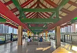 Like many stations on the initial MRT network, Lakeside has an island platform.[40] A feature of the station, the curved roof is based on traditional Chinese architecture. The roof was a part of SMRT's idea to give the stations an "ethnic touch".[14] Specifically, the designer of the station Scott Danielson of Parson Brinckerhoff said that "the more [he traveled], the more disturbed [he became by] architects failing to reflect their own culture" and therefore incorporated a Chinese roof design due to the station's proximity to the Chinese Garden.[41] The design is noted to be similar to the nearby Chinese Garden station, whose roof is held by "chili-green and hongbao-red" decorative beams.[15] Additionally, there is also a mural created by local artist Anthony Chong as a part of SMRT's heritage-themed Comic Connect.[42] The mural displays the history of different landmarks such as Jurong Lake, Old Jurong Fire Station, and the former Taman Jurong Camp, now Taman Jurong Green, was where Singapore's first batch of national servicemen were enlisted.[43]