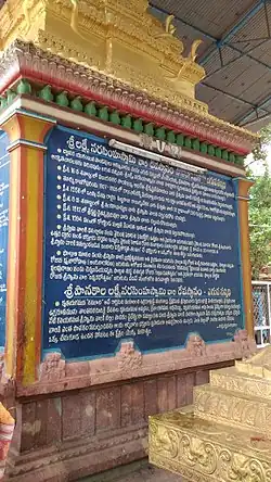 The Lakshmi Narasimha Temple is popularly believed to have been discovered by Yudhishthira, the eldest Pandava brother.[4] The temple's history is said to be recorded in the Brahma Vaivarta Purana, one of the old Hindu religious scriptures.[4] This temple was patronized by the Vijayanagara rulers. There is an inscription from the time of Krishnadevaraya, who had visited the temple, at the temple site.[4] The temple's tall eleven story gali gopuram was built by Vasireddy Venkatadri Nayudu, a zamindari patron and devotee of Narasimha.[4]