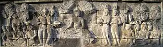 The Borobudur reliefs contain a series of panels depicting the life of the Buddha as described in the Lalitavistara Sutra.[3] In these reliefs, the story starts from the glorious descent of the Buddha from the Tushita heaven, and ends with his first sermon in the Deer Park.