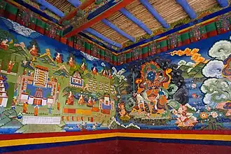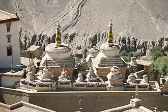 The gompa consisted originally of five buildings, and some remains of the four corner buildings can still be seen.[5]