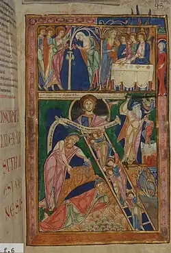 The Lambeth Bible pays special attention to the book of Genesis, as is indicated by the inclusion of both a full-page illuminated miniature and a historiated initial at the beginning of the book.[13] The miniature illustrates three events from the lives of Abraham, Isaac, and Jacob.[14] It is noteworthy that the scenes depicted here were rarely used to illustrate the book of Genesis in the giant Romanesque Bibles.[13] The illustration is divided into two main sections by a border. The top section depicts Abraham's philoxenia, also known as the Hospitality of Abraham, where three angels visit Abraham and Sarah.[14] In the bottom section, the author portrays Jacob's Dream with the ladder to heaven running diagonally across the picture plane, dividing the bottom section into two subsections. In the bottom left corner, Jacob is shown anointing the stone above a second image of him falling asleep, next to which Jacob's ladder divides the picture plane.[14] On the other side of the ladder, in the top right corner, the Sacrifice of Isaac is depicted.[14] The iconography of each biblical scene depicted within the Genesis miniature provides insight into the iconographical sources used for the illumination of the Lambeth Bible.
