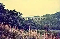 Lambley viaduct crosses the River South Tyne as a series of elegant stone arches. More than 260 m (850 ft) long, it was one of nine viaducts on the former Haltwhistle to Alston railway.[3][4] This was opened in 1852 to haul coal and lead from the Alston mines, closed in 1976, and the viaduct was allowed to decay.[5] In 1991 the British Rail Property Board agreed to repair the viaduct and hand it over to the North Pennine Heritage Trust which would maintain it in the future; however the Trust went into administration in 2011.[6][7]
