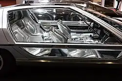 The Marzal's styling was radical at the time of its introduction, with magazine Road & Track calling it "A Bertone design so fresh that everything else looks old fashioned."[5] It was distinguished by glazed gull-wing doors and a strong hexagonal motif throughout, including in the louvered rear window, interior trim and unique Campagnolo magnesium wheels. Other innovative styling elements included silver interior upholstery and 6 narrow S.E.V. Marchal headlamps in the thin, wedge-shaped nose.[4][6]