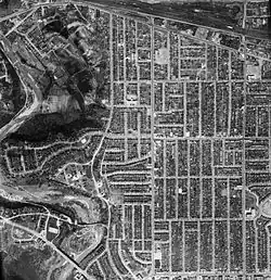 Many streets in this neighbourhood are named after Baby's family.[1] His heirs lived at Baby Point until 1910, when the government acquired the land with the intention of establishing a military base and barracks at the site. The government eventually changed their plans and sold the land to a developer named Home Smith, who began developing a subdivision in 1912. Home Smith would later develop a residential area across the Humber, The Kingsway.