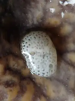 The shell is not visible externally because it is completely covered by the mantle. The shell is thin, smooth and fragile, and consists of two whorls with an unobtrusive spire and a somewhat depressed profile. The largest whorl is equivalent to the total height of the shell. The aperture is extremely wide. There is no operculum and the maximum dimensions of the shell are 9.5 by 5 mm (0.4 by 0.2 in). The part of the animal that is visible is the mantle, and this is smoother and less domed than the rather similar Lamellaria perspicua. It grows to about 10 mm (0.4 in) long by 6 mm (0.2 in) wide and is oval in shape, with a siphonal notch at the front. The colour varies but tends to be some shade of tan or brown, with darker flecks.[3]
