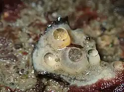 This snail both feeds on ascidians and lays its eggs on them. The colour and texture of the mollusc often closely resemble the surface of the compound ascidian on which it is living, which fact renders the mollusc well-camouflaged.[6] Some individuals have red patches which resemble small colonies of sponge, and others have been observed with the tubercles coloured in such a way as to resemble acorn barnacles. These colourings make it difficult for potential predators to detect the molluscs, and another defensive mechanism is acid-secreting glands in the dorsal epidermis that make the molluscs distasteful to fish.[6]