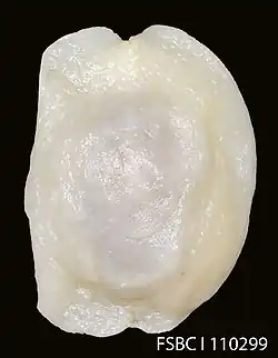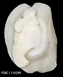 The shell is not visible externally because it is completely surrounded by the mantle. The shell is thin, smooth and fragile, and consists of two to three whorls with a short spire. The last whorl is 95% of the total height of the shell. The aperture is very wide and somewhat spoon-shaped, being extended slightly to the right. There is no operculum and the shell is up to 10 mm (0.4 in) long.[4]