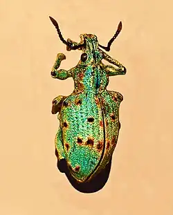 Lamprocyphus germari can reach a length of about 23 millimetres (0.91 in). This rare beetle is glossy, light green, with black spots surrounded by coppery scales.