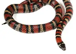 Unlike many of the other Mexican kingsnakes,L. ruthveni has a fairly consistent coloration, consisting of white stripes on red, bordered by black. The red is always very vivid, and the black banding is relatively thick compared to that of the other Mexican kingsnakes. The body can be up to 127 cm long and has a ventral scale count of 182-195 ventral scales. The head is distinct from the neck, and the eyes are distinct from the head, with the eyes having a golden-brown coloration. [5]