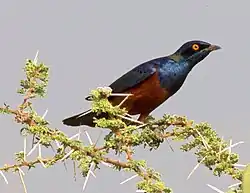 | Chestnut-bellied starling | Lamprotornis pulcher[5] (formerly Spreo pulcher) |
