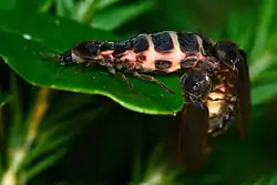 The eggs hatch after two or three weeks, possibly longer in colder climates.[8] Larvae and adult females look similar, but larvae have bright spots on each of 12 segments, whereas adult females have a completely black back.